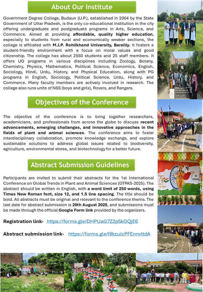 The conference will focus on recent discoveries, innovative technologies, and sustainable practices in plant and animal sciences, highlighting their critical roles in addressing global issues such as climate change, food security, biodiversity loss, and ecosystem restoration By promoting cross-disciplinary collaborations, the conference aims to bridge gaps between traditional knowledge and modern science, inspiring new perspectives and practical solutions for a healthier planet and a sustainable future.